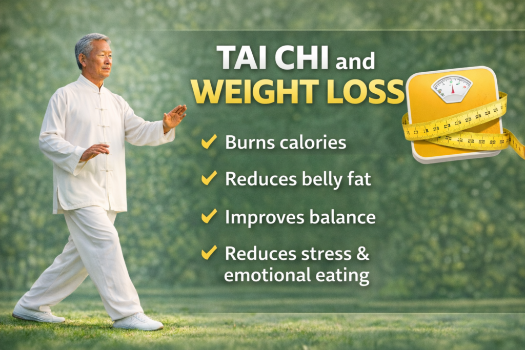 Although tai chi does promote weight in belly fat in several ways, its mind body practices reduce weight, and promote injury prevention and low impact exercise for all ages. It promotes balance and mindfulness, helping people to manage stress and cravings.